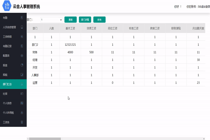 此模塊統計所有部門人員的工資和出勤,可查看某個部門的每位人員詳細情況。